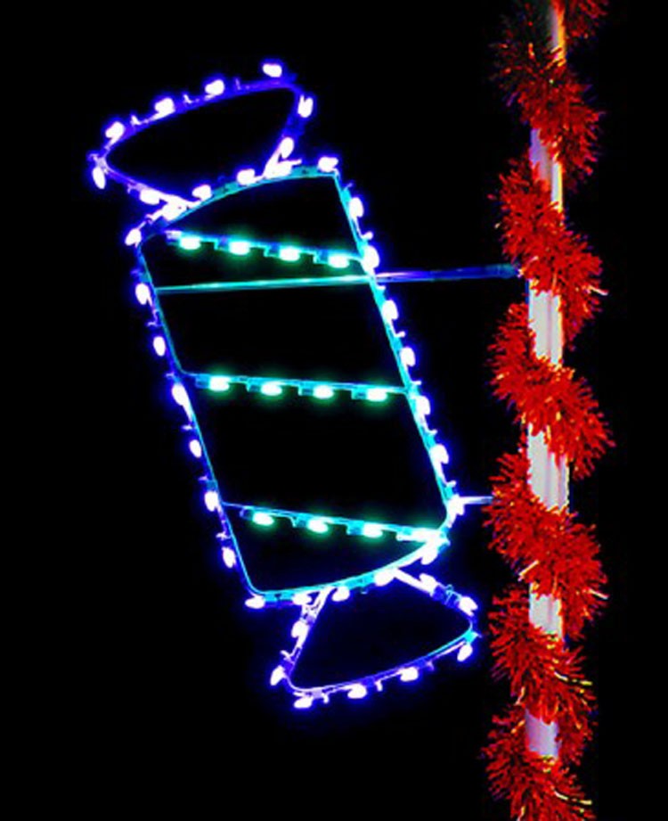 This fun and simple Candy ornament is the perfect understated addition to your holiday decor. It is lit with 52 C-7 Multi-Colored LED bulbs. The Wrapped Candy is available as a silhouette or with garlands. Complete with either our Standard or Mini Pole Mount Hardware and Bands.