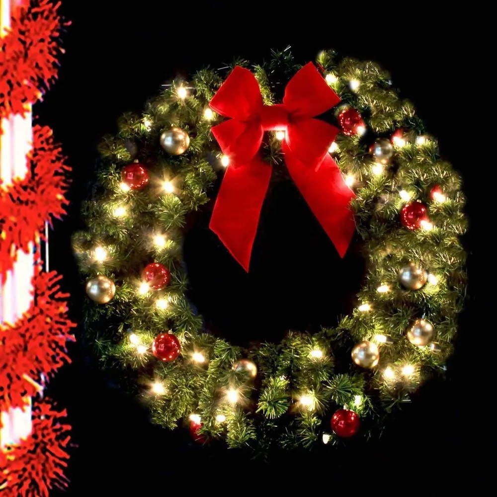 "HAVE IT YOUR WAY" Let Manneco build your wreath the way you want it. Choose from several sizes, styles, types of garlands, lighting, ornamentation and bows. So many choices! Way too many to list. Pole wrap is optional and sold separately.