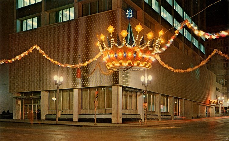 THESE SPECTACULAR CROWNS WERE CREATED FOR THE DOWNTOWN MERCHANTS ASSOCIATION OF KANSAS CITY, MO AND WERE LIGHTED WITH HUNDREDS OF 60, COLORED INCANDESCENT LAMPS; RED, YELLOW AND BLUE.